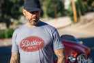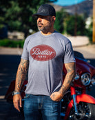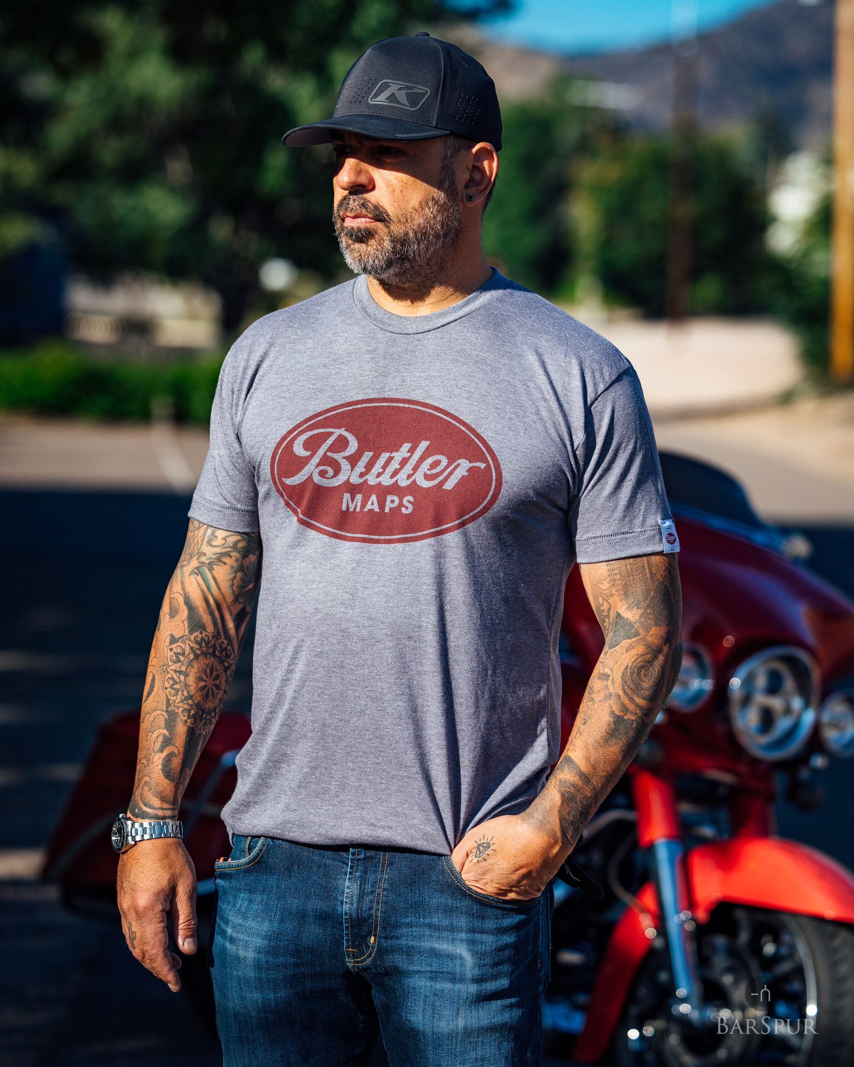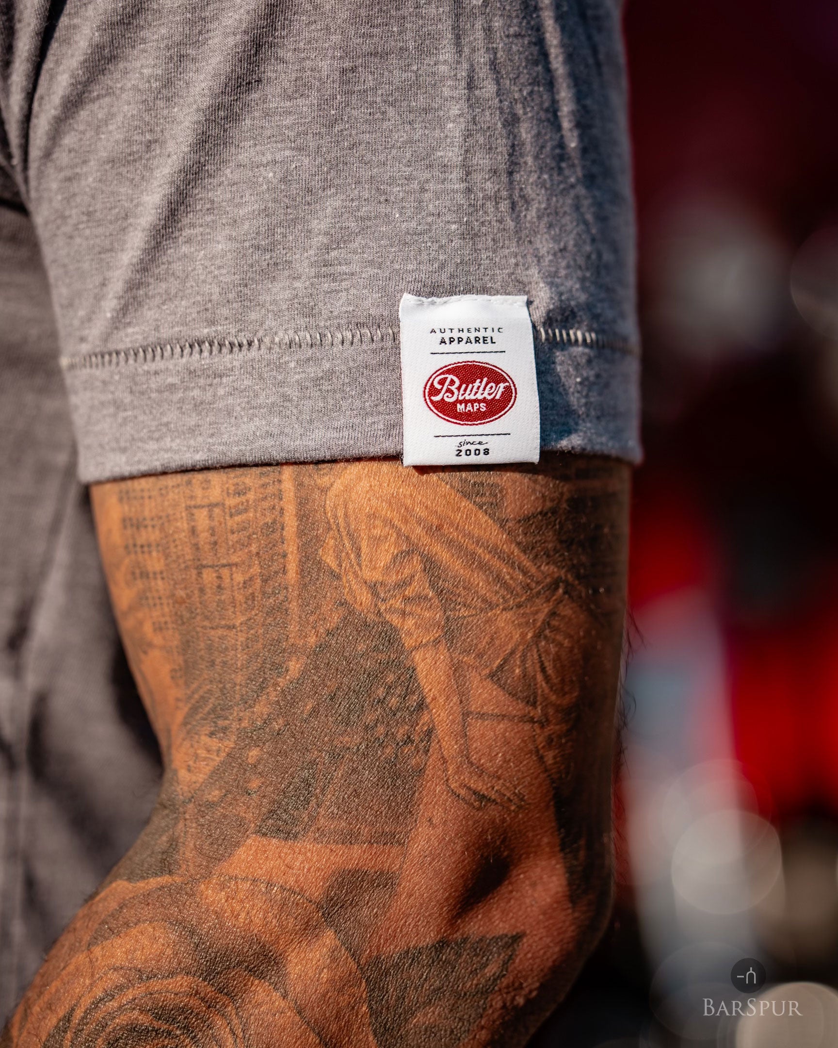 Step out in comfort and style with this buttery soft tri-blend Butler Maps T-Shirt. This shirt features a vintage, screen-printed maroon logo on a heather grey shirt with a sewn-on sleeve tag showcasing our very own 'Butler Maps Authentic Apparel' collection. Plan your next adventure in this straight-fit, super comfy shirt!