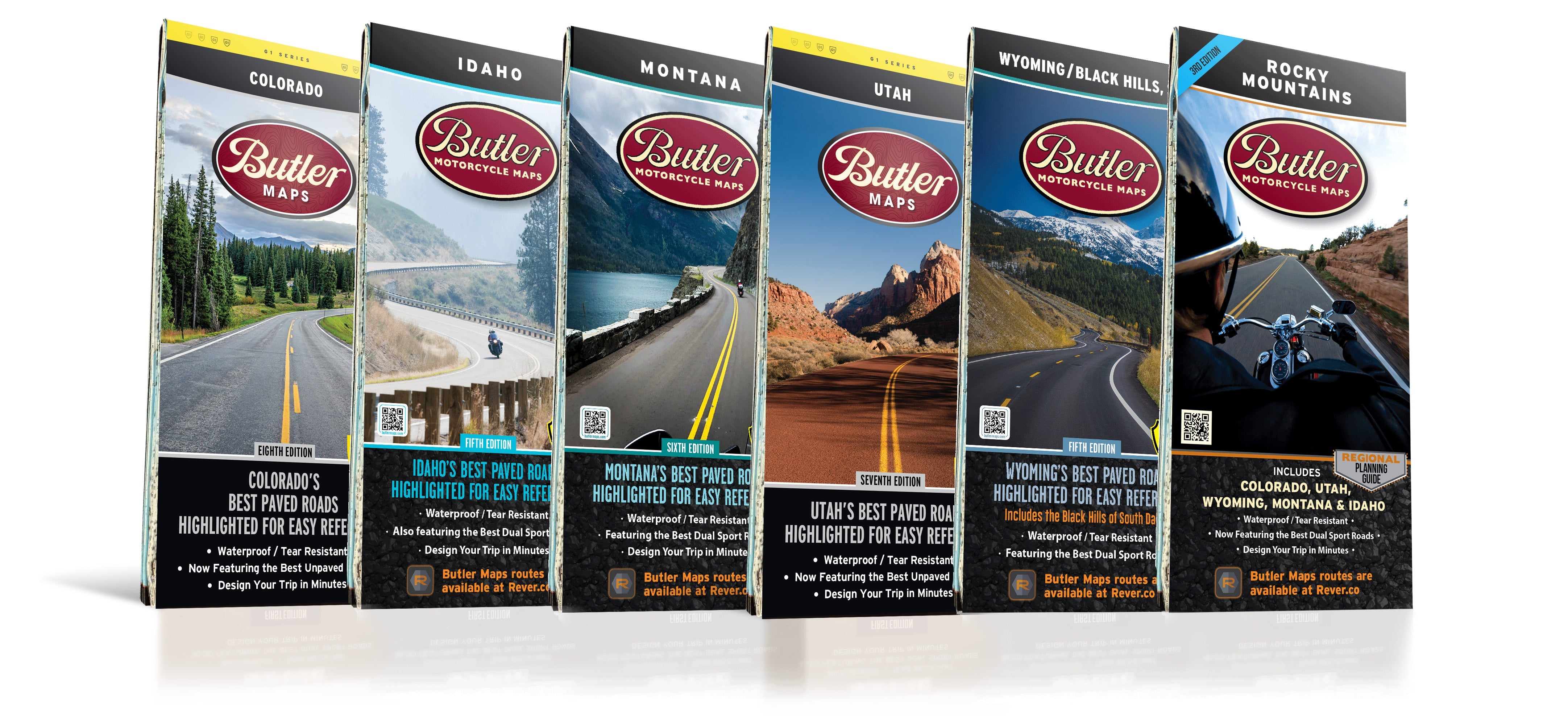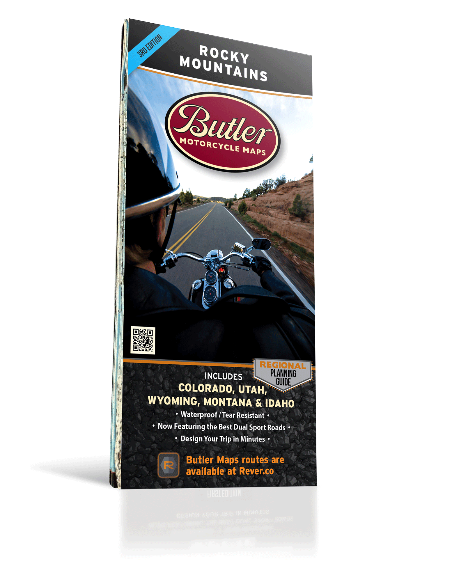 Every Butler Maps G1 Series map is printed on “Trail Tough" waterproof, tear-resistant paper called HopSyn. A full alpha-numeric grid is printed on each map to aid with navigation and orientation. All of our G1-Series paved road maps also feature over 40 recommended dual-sport roads so you can opt from the best paved sections of road to the best dirt sections of road simply by following the colors and icons. Find the best riding, with the most scenic views, packed full of drama and peril in this G1-Series Rocky Mountain map Collection!
