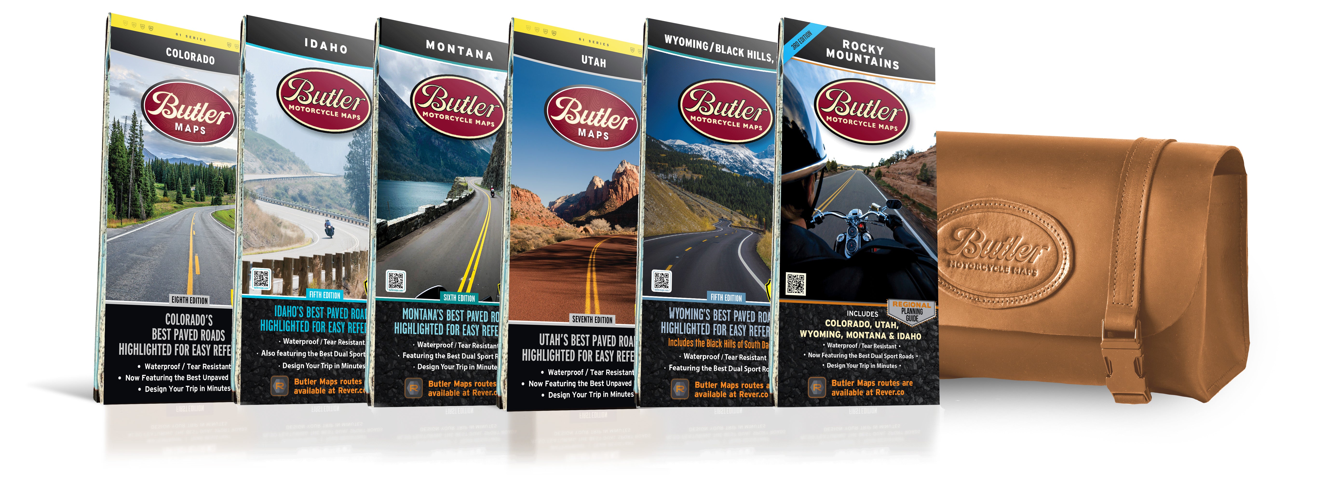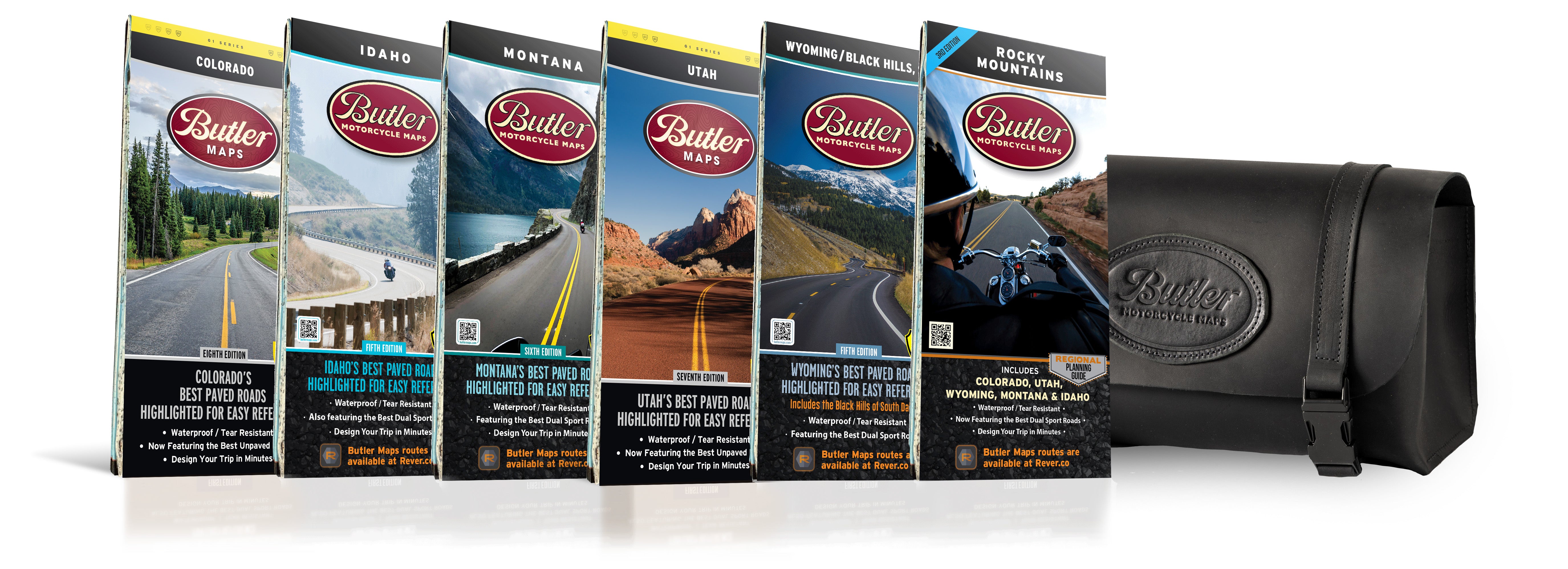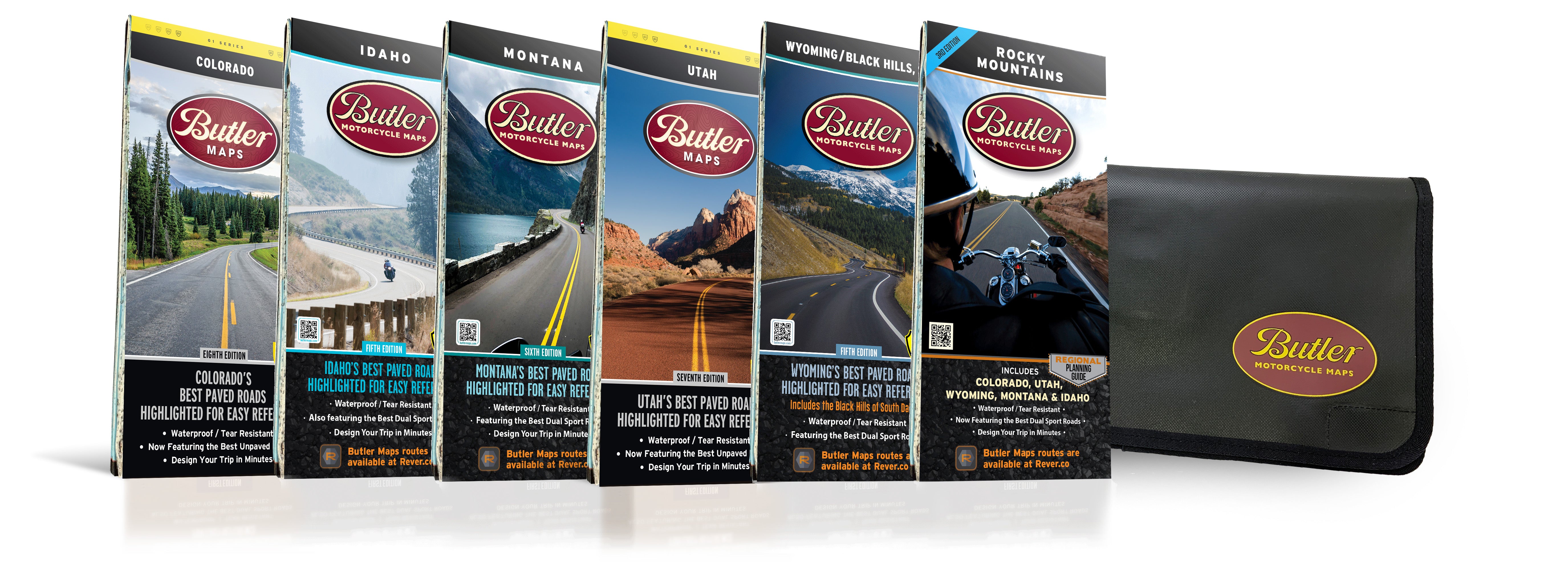 This was our first collection of maps we released over 12 years ago. All Butler G1-Series maps are updated every year with a ton of new and accurate information to make your adventures the best they can be. The crew at Butler Maps is small, however we ride a tremendous amount of miles each year trying to find the greatest experiences on a motorcycle. We wore out a fleet of bikes creating the maps for this collection–a whopping 166,000 miles of targeted and focused riding within Colorado, Utah, Wyoming, Idaho and Montana. Think you’ve got a large bucket list of rides checked off? Compare it against ours and see where you rank. Of course we have Independence Pass, Beartooth Hwy, Lolo Pass, Colorado River Scenic Byway, Going-to-the-Sun Highway and Million Dollar Highway, those are no-brainers but how about Harper’s Corner, St. Joe River Scenic Byway, Winchester Grade, Butterfield Canyon, Mt. Nebo Loop Road or Ninemile Creek Road? These are just a few of the many secrets our maps offer! We’ve included thousands of miles of the most dramatic sections of paved and dirt roads highlighted in Butler Maps popular Gold, Red and Orange colors and are accompanied by crucial information about places to eat, sleep, fuel up and cool down. You will also find detailed inset boxes showcasing a complete list of campgrounds, town/pass elevations, trailheads, parking lots, scenic overlooks, interpretive trails, contour intervals, secondary/tertiary roads as well as all dirt thoroughfare options through the Rocky Mountain landscape.